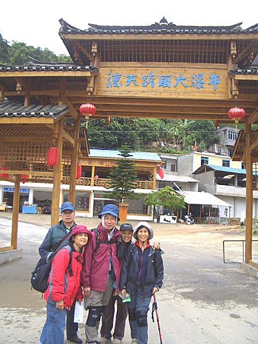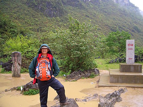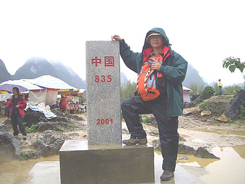 在瀑布下瀏覽約30分鐘後,上岸到約定的地點會面,這時突然下起大雨,今早雨傘剛遺失馬上碰到大雨,運氣未免太好了吧!還好王兄在出發前要我一定要帶Gotex那件外套,(1萬3買了3年都沒機會穿,心理一直很嘔)終於發揮價值了.雨勢忽大忽小,大家雨中漫步往位於瀑布上方第53號中越界碑走(西元1896年,滿清政府根據《中法天津條約》在此處立下) ,到了中越界碑,攤販密集,形成一條小型購物街,因雨勢蠻大無心採購,大家在界碑下拍照留念後,就打道回府了.