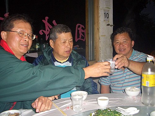 晚餐我們自行買菜,本來想借用友誼賓館廚房煮飯,但發現廚房設備不佳,而且大家也累了,經老闆介紹了一家農家餐廳幫忙料理,每道菜收4元費用,大家並邀請賓館老闆一起用餐,他也爽快的帶了2瓶自釀小米酒來赴宴.整個晚上大家把酒言歡, 對酒當歌,氣氛駭到不行,兩瓶小米酒沒多久就喝光了,老闆欲罷不能還要回去拿酒,但大家已經又累又醉了,加上老闆女兒不放心一直來催他回去,因此婉拒老闆盛情,大家帶著濃濃酒意,搖搖擺擺的回賓館休息,結束一天精采的假期.