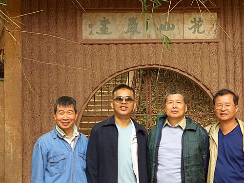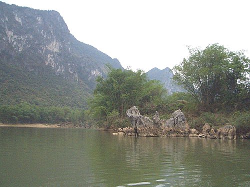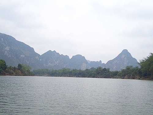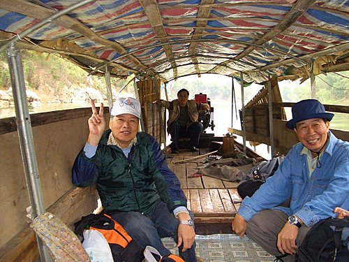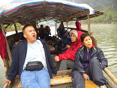 接下來大家分頭找前往花山的交通工具.經比價,小箱型車1輛50元小摩的(摩托車改裝成三輪車)1輛30元依背包客精神當然選小摩的.黃兄很慎重.選了女師傅開的車.麗珍選了內部裝潢像LV包的車.戲稱坐在LV裡身價不同了.路況不佳,一路顛簸,晃了1個多鐘頭到了花山,真佩服這幾位大姐一句怨言都沒有(如我感覺錯了,可在我的部落格上糾正)到了售票口買票,每人80元,經議價後8人可買5張票,但另外要給30元响導費,這和我們打聽到價格有些出入,因此大家決定先在附近逛逛再說,順著鄉間小路邊走邊聊,看到河邊有一家農家餐廳,就進去借廁所,順便和餐聽老闆娘打聽,有無其他方式去花山,她說公家船開的很快,又不能在花山崖下停船,讓遊客上山.建議搭她們家的竹筏,可以很悠閒的沿明江而上,並可以在花山崖下停靠,讓我們上山拍照,經議價後每人40元,另外包他家的車回寧明1輛40元(箱型車1輛可載所有的人),並訂好9菜1湯170元的農家宴.(跟原先預算總共省了130元,雖然不多,但長期下來,就會積少成多.)