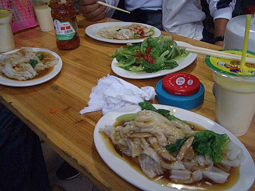 早上6點多就起床,盥洗好後,就到附近傳統市場逛逛.看見一家賣腸粉的早餐店生意不錯,也還蠻乾淨.王兄說來大陸就應該要吃當地的特色美食,因此就走進去吃早餐,點了一盤腸粉及燙青菜加一杯豆漿共3元RMB,實在很便宜,腸粉也很美味.