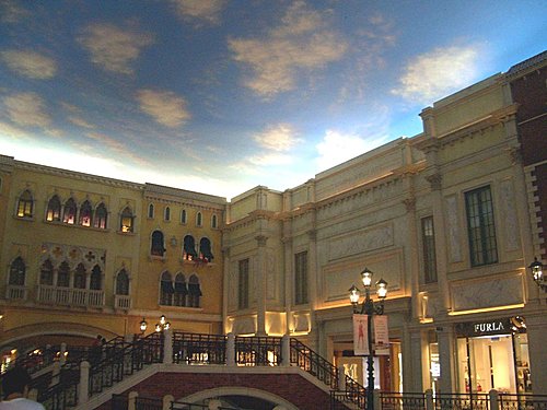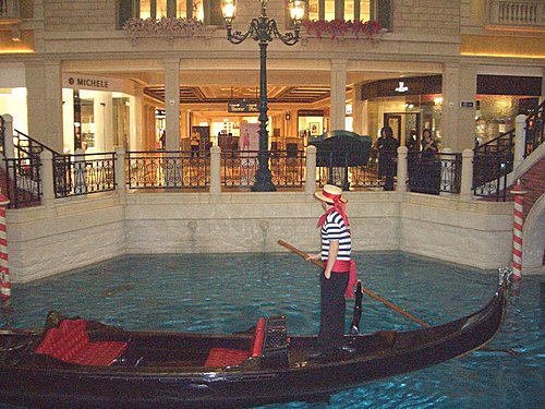 威尼斯人飯店裡的購物商場、餐廳、名品店、服飾店林立,而且外觀都裝潢成歐式建築,加上"偽"天空、噴水池、路燈,讓來到澳門的人,卻有種像走在歐洲的街道上的錯覺,其中,覺得最特別的,莫過於還能夠在這裡坐到義大利威尼斯著名的貢多拉,以及看到在義大利四處能見到的街頭藝人,試圖完全複製威尼斯當地的特色,而不用坐上十幾個小時的飛機,飛越好幾個國家,就能見到類似的場景及事物。