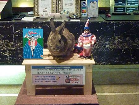 飯店櫃檯前的招牌兔子,靜悄悄的蹲在那裏,不注意還以為是假的.