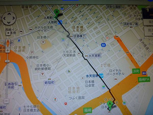 從住的飯店 Hotel Villa Fontaine Nihombashi Hakozaki 走到人形町站搭車約800公尺.