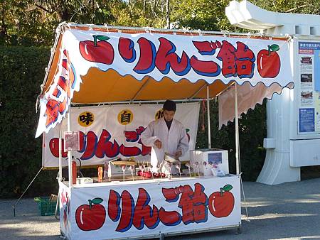 「七五三」節時,走向八幡宮的參道兩側旁會陳設很多擺販,賣著諸多小吃與小朋友喜愛的玩具。可惜時間已過了所以今天攤販並不多.
