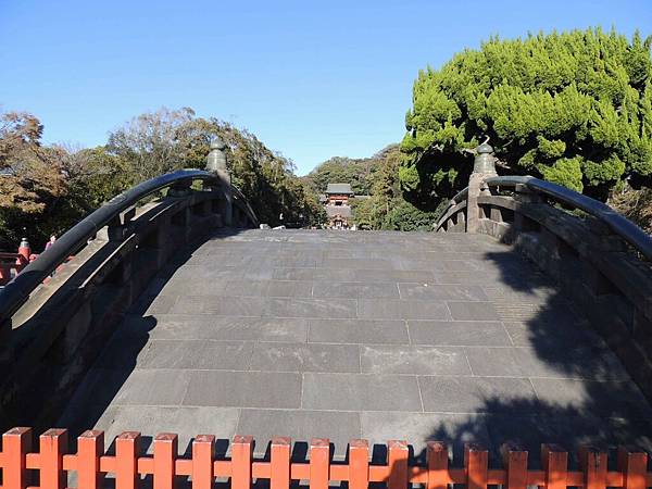 太鼓橋,原來是朱紅色的木橋,後來改建為石橋。太鼓橋是給神明走的,所以不開放。