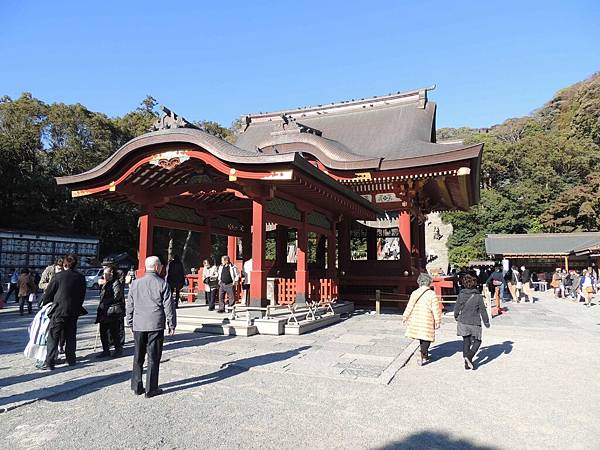 走到八幡宮前的大廣場,廣場中間最吸睛的便是華麗又質純的舞殿。相傳是當年源賴朝在追殺其弟源義經時,將他的妻子靜御前虜來,而命已懷有身孕的她在舞殿跳舞娛樂賓客;當時的靜御前一邊跳著舞,一邊藉由唱歌來表達對丈夫的思念。此舉令源賴朝非常震怒,但贏得其妻政子的共鳴。後來靜御前產下一子,被源賴朝斬草除根,而鬱鬱寡歡的靜御前,最後也香消玉殞得年20歲。