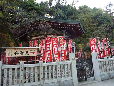 江島神社同時也是日本3大弁財天神寺廟之一,是主管音樂和娛樂的女神,所以在這裡可以常看到女神的樂器~琵琶狀的標誌。