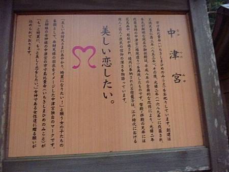 中津宮,這裡是供奉「市寸島比賣命」神,主要掌管姻緣,因此可以看到一些情侶手牽手走到這裡祈緣.