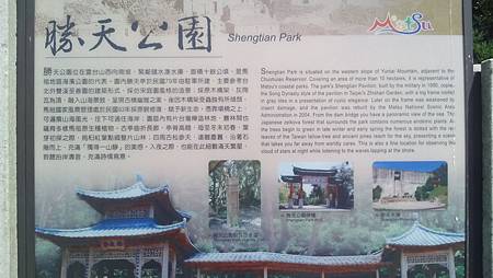 勝天公園位在雲台山西向側坡,緊鄰儲水澳水庫,面積十餘公頃,是馬祖地區海濱公園的代表。園內勝天亭於民國79年由駐軍所建,主要參考台北外雙溪至善園的建築形式,採仿宋庭園風格的造景;採原木構架,灰陶瓦為頂,融入山海景致,呈現古樸幽雅之美。後因木構架受蟲蝕有所傾頹,馬祖國家風景管理處於民國93年採原貌修復,賦予新生命。 資料來源:馬祖國家風景區全球資訊網.