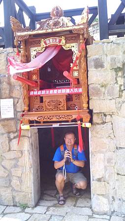 馬祖宗教文化園區建造前,當地人在勘查地形時,意外發現在巨神底下一處穿越山壁之坑道,遂在坑道口置上媽祖神轎,民眾朝聖時鑽入神轎下穿越坑道祈福.