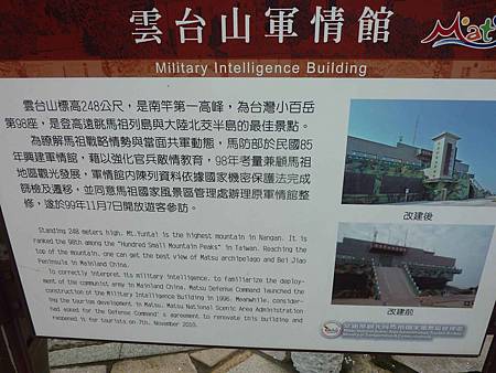 為瞭解馬祖戰略情勢與當面共軍動態,馬防部於民國85年興建軍情館,藉以強化官兵敵情教育,98年考量兼顧馬祖地區觀光發展,軍情館內陳列資料依據國家機密保護法完成篩檢及遷移,並同意馬祖國家風景區管理處辦理原軍情館整修,遂於99年11月7日開放遊客參訪。資料來源:馬祖國家風景區全球資訊網.