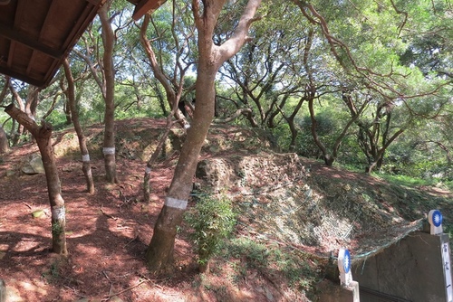 「二四○榴炮」就在相思樹林圍繞下,靜靜地伏臥在砲堡前。做為掩蔽用的相思樹,每棵腰身上都劃有白線,若戰事一起,必須依白線高度將樹鋸斷,避免干擾射擊。