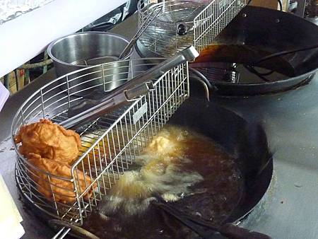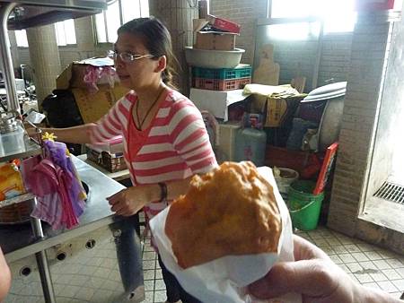 裡頭包的是米粉跟醃漬過的肉,外皮炸的酥脆.一個30元.(加蛋35元,虫弟餅獅子市場也有一家再賣,但晚去就賣光了).