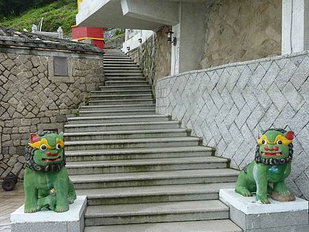 芹壁天后宮這對綠身「軍獅」其實有段故事。芹壁70雄獅坑道據點開鑿完成,當時的師長有感於天后宮保佑讓工程順利完工,希望贈送一對獅子給廟裡;早年物力維艱,軍方沒能力刻石獅,只能用水泥來雕塑,但兵工從沒做過水泥獅子,不知從何下手,於是當地有人提供了一張舞龍舞獅的照片給軍方參考,後來阿兵哥就看著照片做出了這對水泥獅,所以這對喜感十足的石獅看起來跟現在民俗技藝團的舞獅頭很像。(其實這對石獅最原始的顏色並不是現在看到的綠色而是水泥原色,後來廟方信眾漆成黃色,但芹壁天后宮供奉的鐵甲元帥是青蛙神,青蛙是綠色的,所以又改成現在的綠色)。