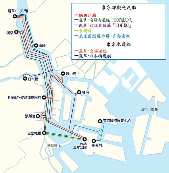 水上巴士共有7個乘船點 (日の出桟橋、浅草、浜離宮、豊洲、お台場海浜公園、パレットタウン、東京ビッグサイト).