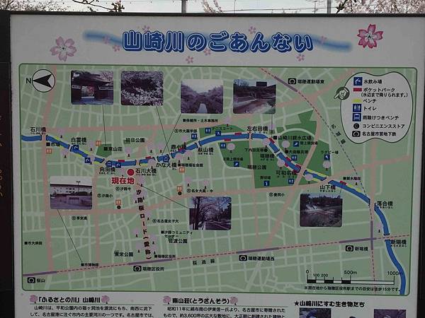 山崎川是日本賞櫻名所百選之一,河岸兩旁種植了約2.8公里的染井吉野櫻,全長13.6公里,上面建設了各種小小的橋供人往來。每年春櫻時節吸引了大批的賞櫻民眾前往。