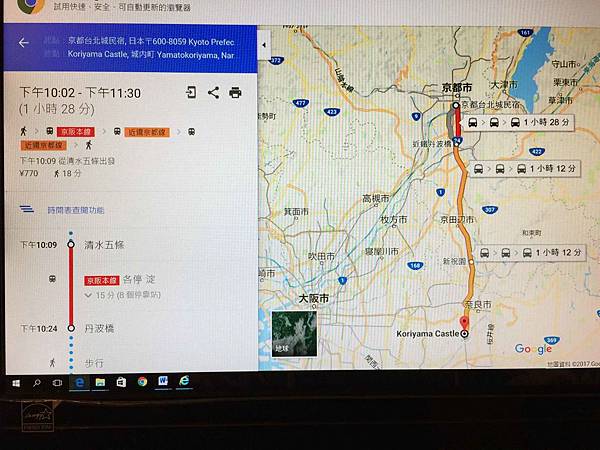 今日的行程:民宿走到附近的清水五條站搭京阪電車到丹波站下車 - 再走到近鐵丹波站約150公尺 -轉搭近鐵到郡山城站下車,走到郡山城遺跡約750公尺.日本的火車都很準時,班次說明很詳細,且都有漢字,不懂日文去日本也沒問題.