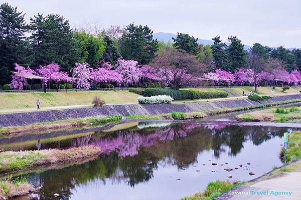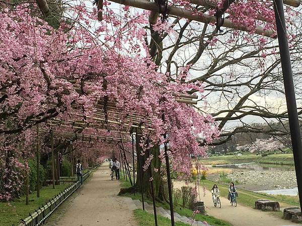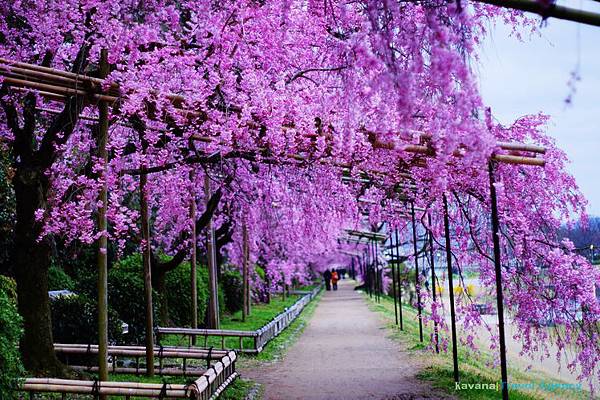 半木の道位於北大路橋(北大路通)至北山大橋(北山通)間,沿著鴨川的河岸,近1公里用棚架支撐的紅枝垂櫻連綿不絕,猶如櫻花隧道繽紛浪漫.