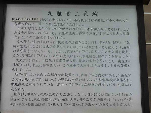 元離宮二條城(俗稱二條城)原為織田信長所建,後為豐臣秀吉所繼承,因戰亂而毀。現存的二條城是1601年(日本慶長6年)徳川家康作為保衛京都御所(皇宮) 以及提供德川家族上洛時的住宿而重建,至今已有400年歷史。