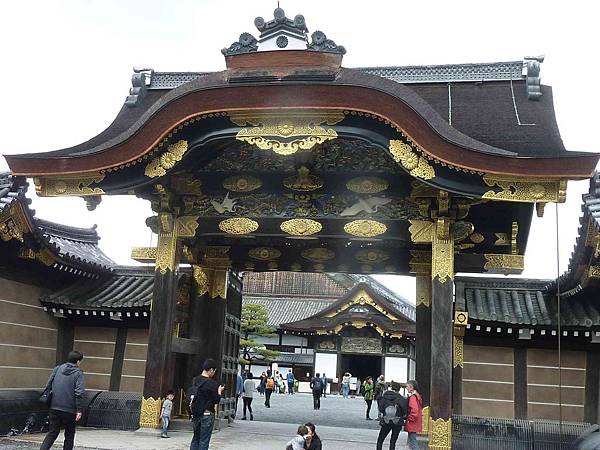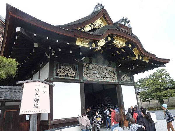 進入二條城首先要經過巨大的唐門, 後到宮殿的入口, 該宮殿的遊廊頂部都有華麗的木雕飛鳥, 孔雀和對稱的美麗花朶, 再經過 ‘鳥鳴走廊’ 來到接待室, 所謂的鳥鳴走廊是建造工藝十分巧妙的一條長廊, 當有人經過或碰觸地板下的一排排釘子, 就會發出如鶯鳥的鳴聲, 這也就提醒城內的守護人員, 而被告知有外人入侵, 由此而產生防御作用.