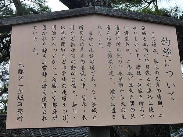 釣鐘,在幕末政變時期二条城用來連絡北邊的所司代(官職,是德川幕府在西國的統治據點,要護衛京都、聯絡朝廷、監督大名)用的。