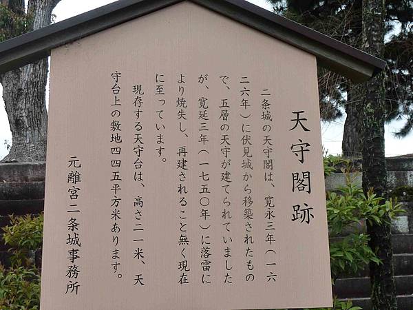 在二條城的最高點是本丸西南角的天守閣, 但因遭雷激劈毀, 至今仍未重建, 遊客目前僅可登上殘留的天守閣的天守台參觀遠眺本丸御殿及本丸庭園景色.