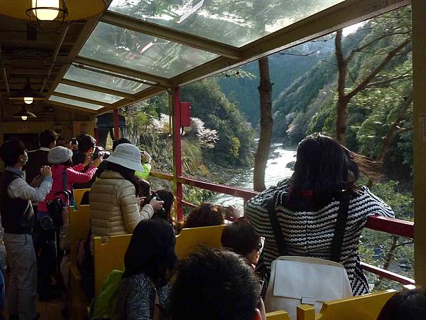 嵯峨觀光列車沿著保津川溪谷緩慢而優雅的行駛,全程7.3公里,單程需時約25分鐘,來回需時約1小時,由嵯峨站起,經嵐山站,保津峽站,至龜岡站止後,原車返回。小火車沿線春天是滿山遍野的櫻花,夏天則是鮮嫩欲滴的新綠,秋天則是一片楓紅,冬天則是銀白世界,搭乘小火車可以盡享京都的四季風情。是大部分遊客來京都必排的行程.