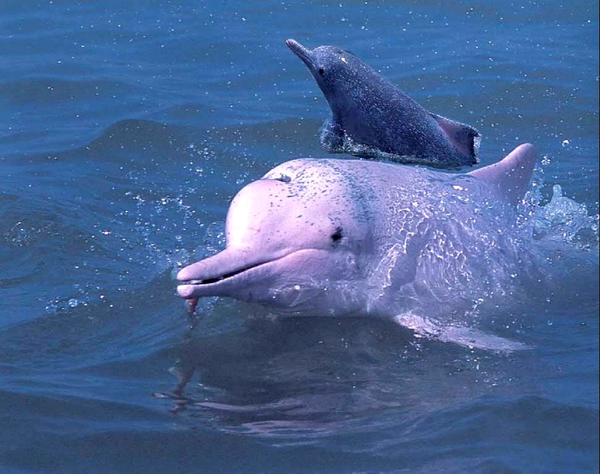 大澳漁村稀有的中華白海豚.剛出生的中華白海豚是呈白色,年輕的會呈灰色,至於成年的則會呈粉紅色。