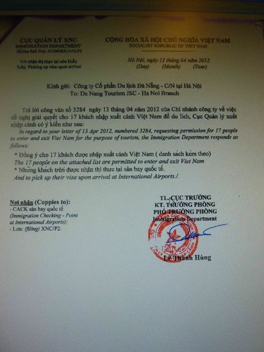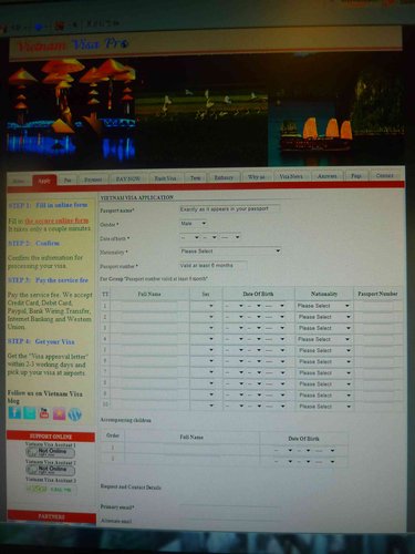 這一趟的越南之旅,讓我學會在網路上辦理越南簽證方式, 在此提供給需要的人參考: 辦簽方式: 1. 越南住台辦事處:,1020+400=1420 。 2. 旅行社代辦:約1550-1700不等 3. 網路E-Visa:網路上申辦時需用paypal繳費10 USD, 到越南時再繳25 USD。蓋章費 實際費用約1000元台幣。 我們人多採用網路上辦越南簽證(2人以上就有優惠, 我們10人每人6美元.由我代辦) 。 實際費用6+25=31美元 (約900元台幣) 流程: 1. 先上http://www.vietnamvisapro.com/網站 2. 依照網上步驟完成: